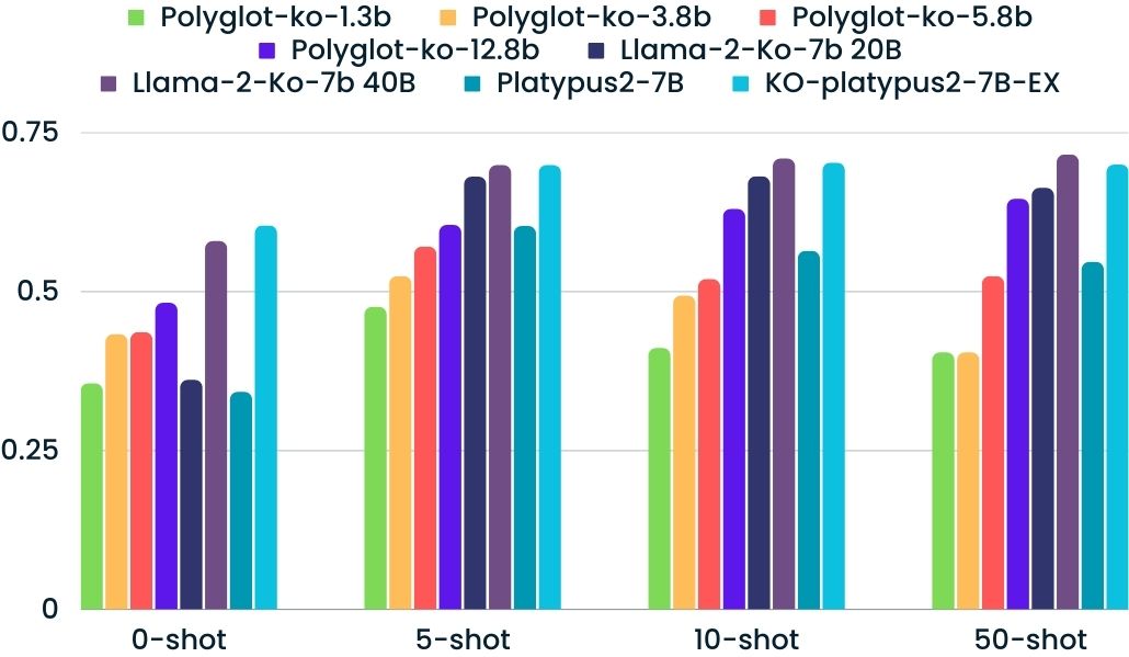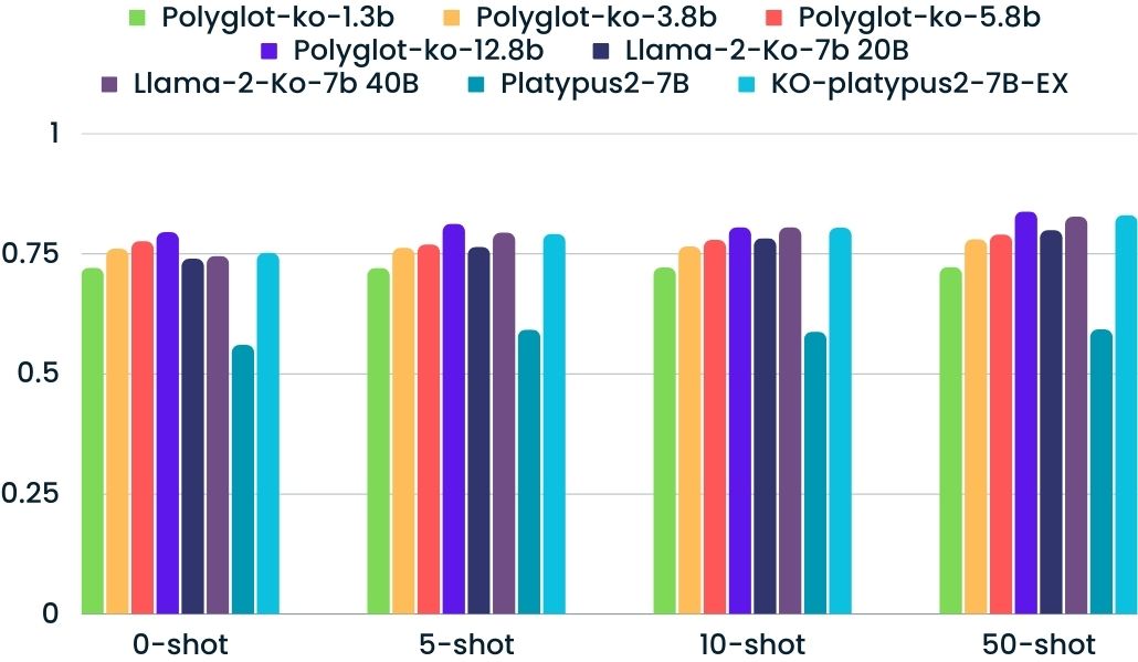 성능적인 측면에서 🥮KO-Platypus2-7B-EX을 보면🥮 zero-shot 부분에서 llama-2-ko보다 높은 성능을 보였고, boolQ에서는 Polyglot-ko보다 높은 성능을 보였습니다.