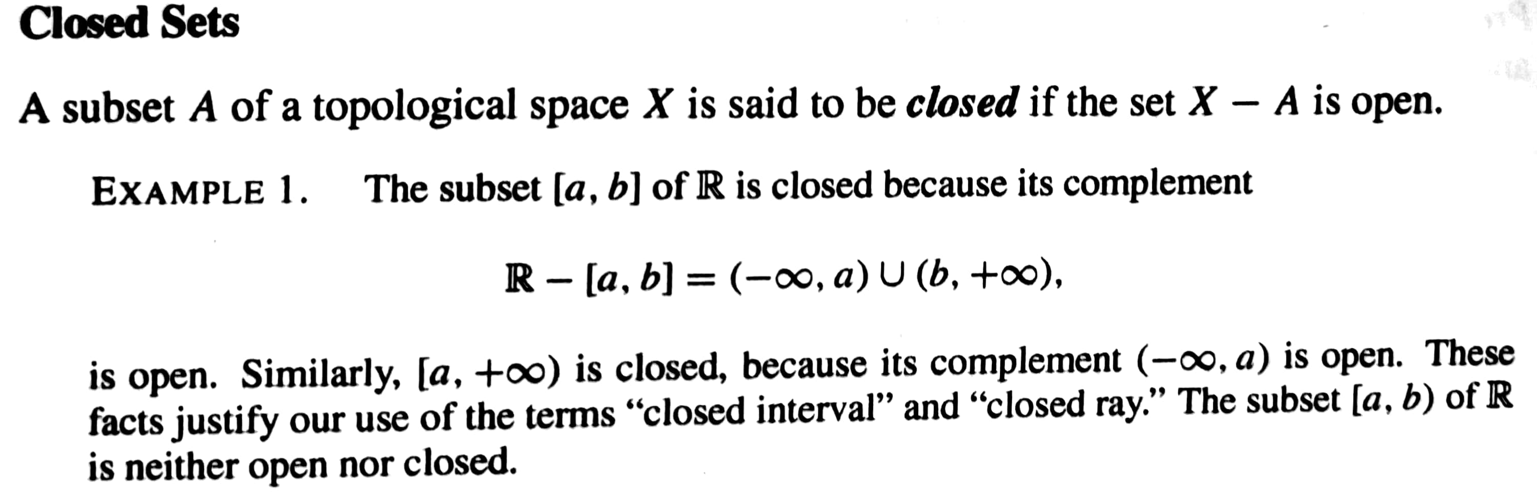 어떤 임의의 Open subset A가 있다면, Topology X에 대해서 X-A는 closed이다.