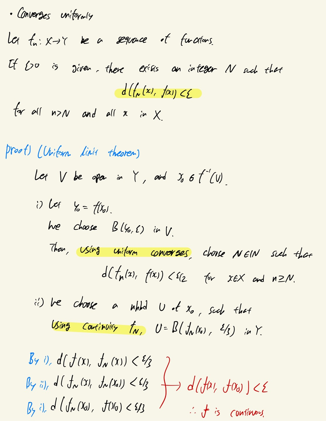 Uniformly converges는 f가 continous하다는 것을 보일 때 이용될 수 있다. (단, Y가 metric topology이어야 함.)