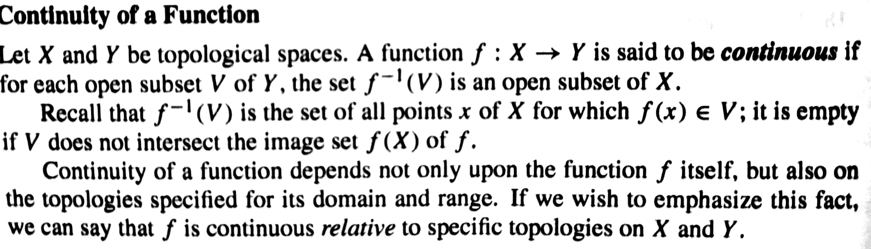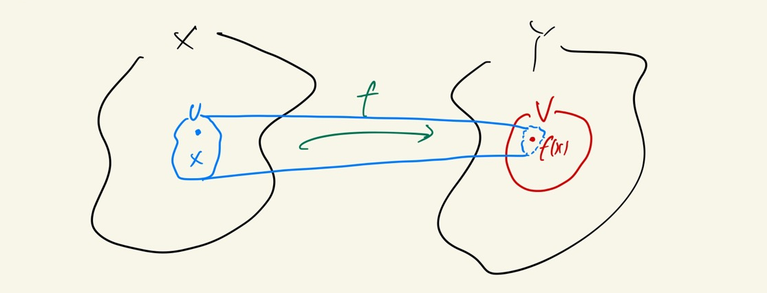 - X에서 Y로 보내는 function F가 있다고 하자. 이때 Y의 open subset A가 있다고 가정하자. 만약 A를 역함수 f를 통해서 매핑된 subset B (in X)가 X에서 open이라면 f는 continuous하다!