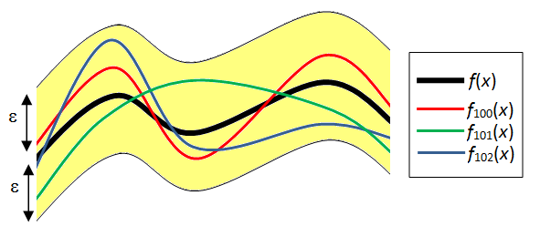 f(x)가 있을 때, fn(x)가 uniformly converges하다는 말은, 모든 x에 대해서 f와 fn의 차이가 임의의 eplison>0 보다 작아야 된다는 의미이다!