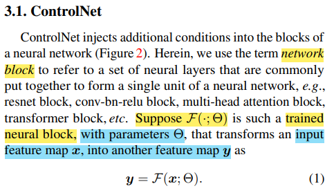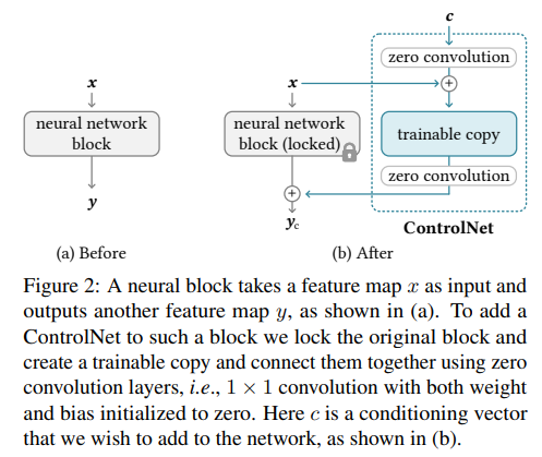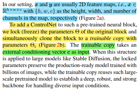 ControlNet은 위에서 정의한 trainable copy와 zero convolution을 이용한다.