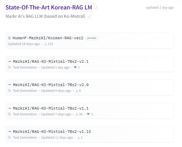MarkrAI RAG Model: https://huggingface.co/MarkrAI/RAG-KO-Mixtral-7Bx2-v2.1