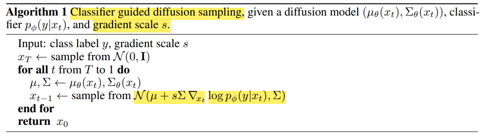 +) 실제로 sampling할 때는 algorithm1 처럼, classifier guidance의 strength를 결정하는 s를 classifier의 gradient에 곱해줘서, 강도를 조절합니다!