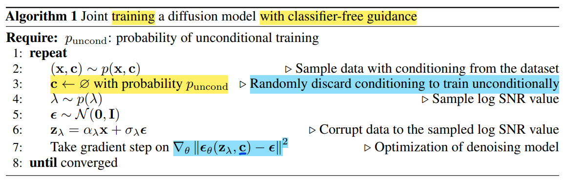Puncond를 활용하여, 특정한 라벨 c를 뽑아내고, forward process에서 만들어진 Zt와 시간 t, 그리고 c를 함께 활용하여 모델을 훈련시킨다.