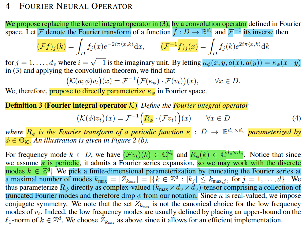 -> 즉, 기존에 정의되던 kernel intergral operator mapping 함수를 fourier transform을 활용해서 재표현한 것이다.