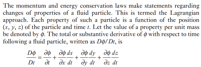 - 그러나 energy나 momentum의 경우 시간에 따른 fluid particle의 특성이 고려되어서 해석이 되어야 하므로, Lagrangian approach로 설명해야함.