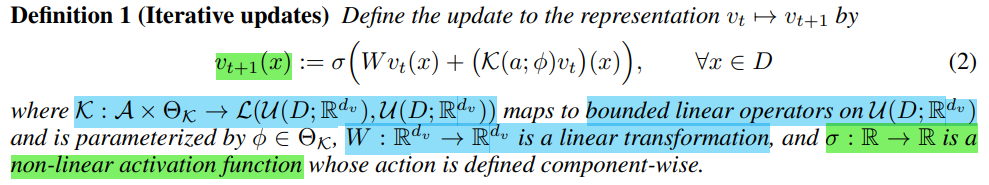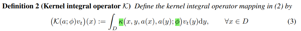 K는 fourier transform을 적용하는 kernel 부분을 나타내는 것이고, W는 Vt(x)에 대한 linear transformation, sigma는 non-linear activation function이다.