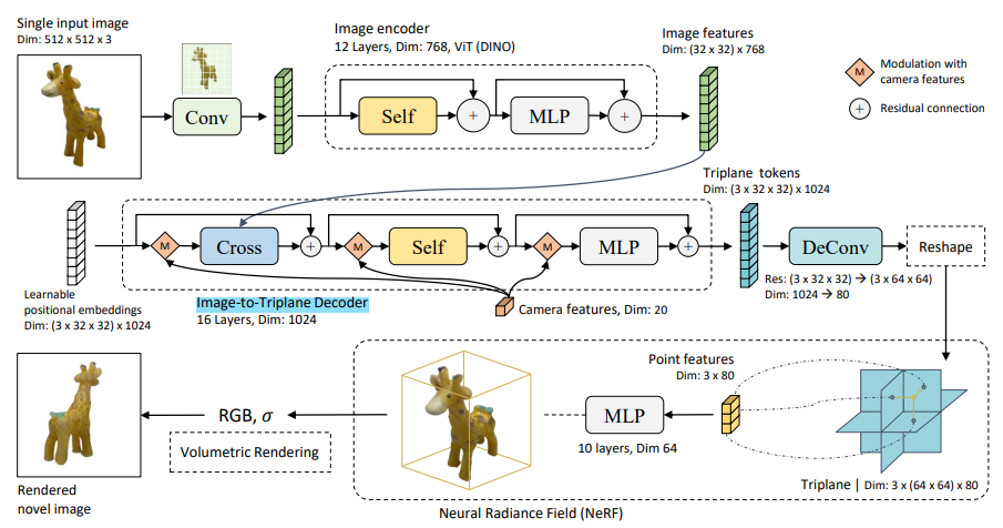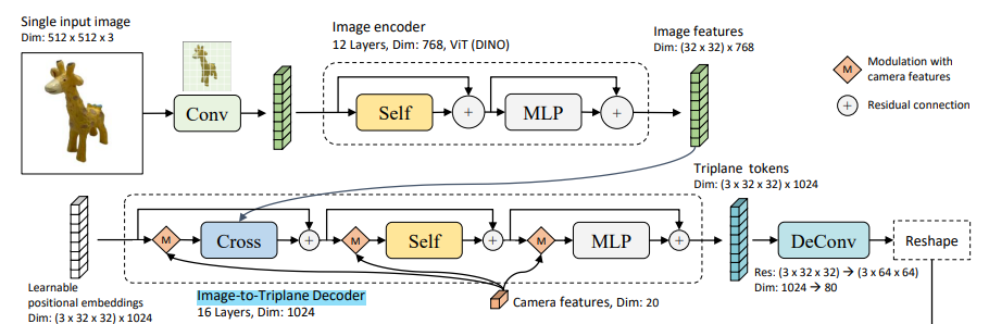즉, 논문의 아이디어는 "camera parameters의 값만을 가지고 learnable positional embeddings을 학습함으로써, 다양한 각도에 대한 이미지의 triplane features(tokens)을 학습"한다는 것이다
