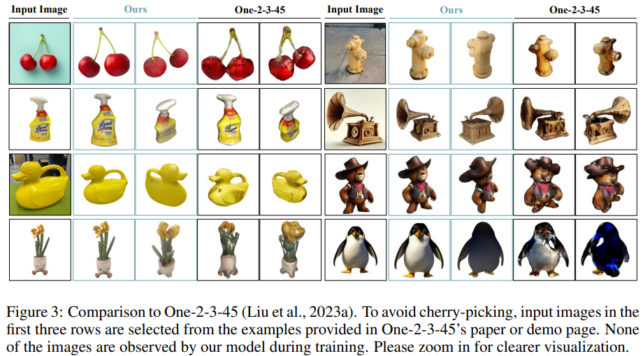 - 기존의 대표적인 single-image-to-3D 모델인 One-2-3보다 성능이 더 좋다는 것을 볼 수 있다.