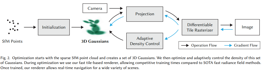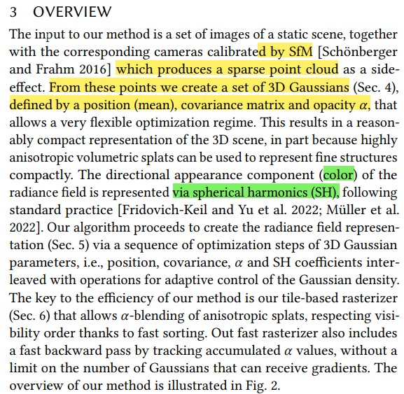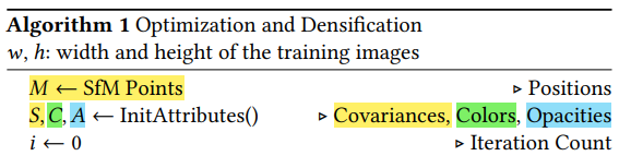 - Camera pose 및 Point cloud 정보를 SfM 알고리즘 통해서 얻고, 3D gaussian 초깃값으로 활용.