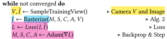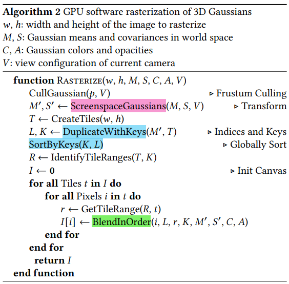 +) 마지막에 있는 BlendInOrder 함수를 통해서 각 gaussian의 opacity color values를 활용해 rendering을 수행하는 것 같다.