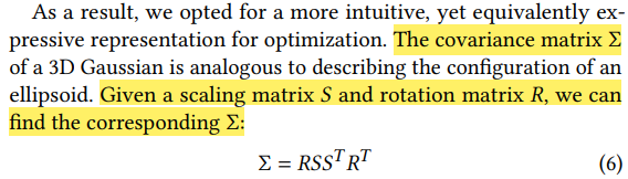 따라서 gaussian의 분포가 변화(transformation)되는 것은 임의의 scaling matrix S와 rotation matrix R이 영향을 주는 것이라고 생각할 수 있습니다.