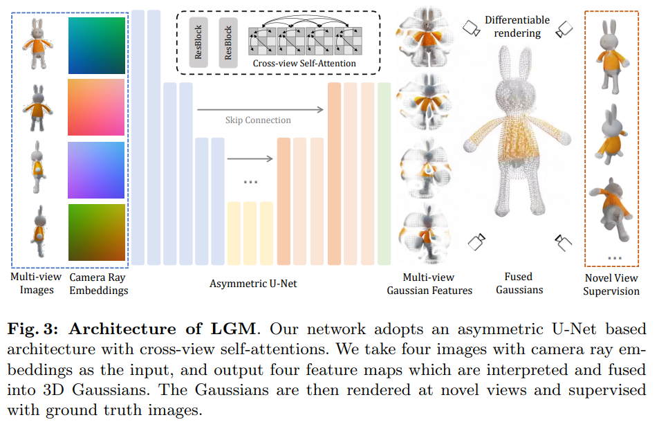 LGM의 구조는 위처럼 asymmetric structure를 가진 U-Net과 3D gaussian으로 구성된다!