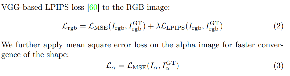 또한 논문에서 활용한 데이터셋 Objaverse에는 RGB+A(alpha)가 들어있으므로, alpha에 대한 차이도 MSE로 활용했다고 언급한다.