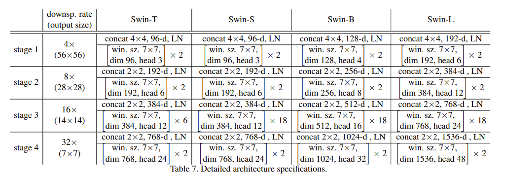 +) 여러 Swin Transformation model이 있다. 한번 정보들을 보면서 위에 내용을 상기해보자.