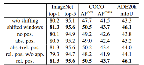 +) 실험을 통해서, relative position bias가 다른 방법론에 비해서 좋다는 것을 증명하였다.