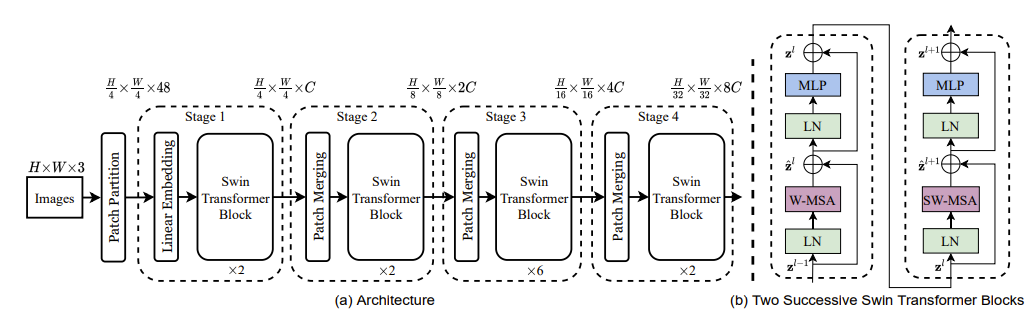Images를 일단 patch로 만들고 swin transformer block에 넣어주는 형태를 반복한다.