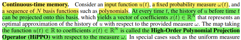 - HiPPO는 f(t)에 대해서 fixed probability measure를 통해 N개의 basis functions으로 구성된 polynomal g(t)를 생성하고, g(t)를 통해서 coefficients를 생성하는 f -> u 간의 mapping operator 모델입니다!