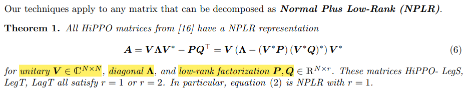 즉, general하게 모든 SSM 관점에서 (HiPPO matrix도 포함) diagonalization을 통해서 A를 V ^(-1)AV와 처럼 표현하기 위해 NPLR을 도입했다고 생각해볼 수 있다.