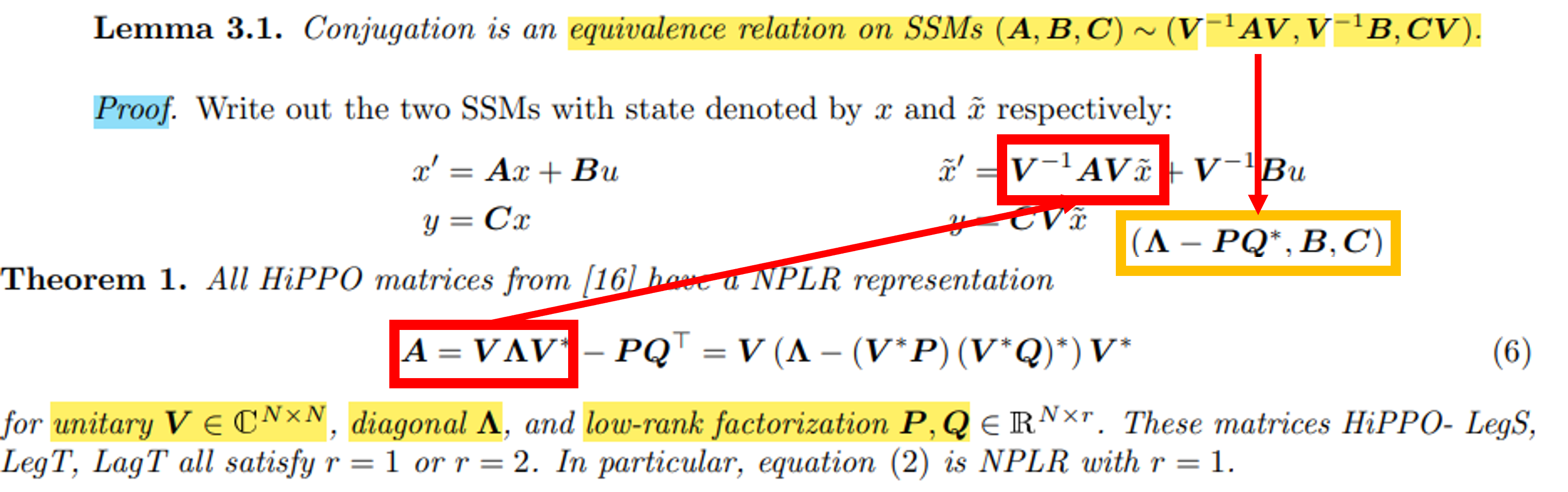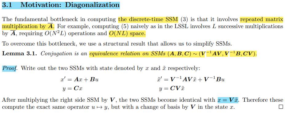 따라서, NPLR을 Lemma 3.1에 대입하게 된다면 SSM은 (A, B, C) ~ (Diagonal - PQ*, B, C)로 재정의 할 수 있다.