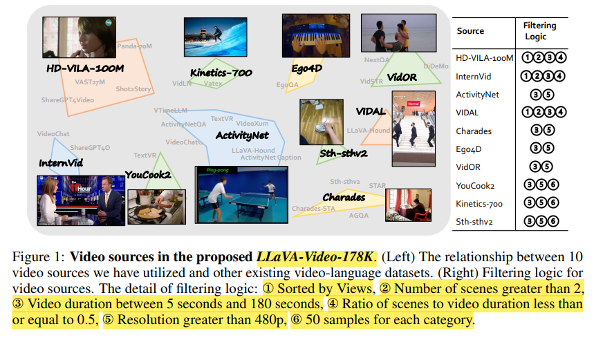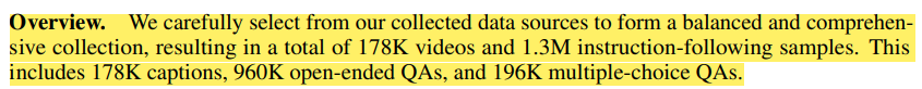 마지막으로, 여러 video-caption 데이터셋에서 video를 어떻게 선별하여 178K를 확보했는지 살펴봅시다!