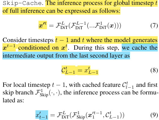 3. T-1 timesteps에서, block 1에서 나온 feature와 caching한 feature를 동시에 활용해서 block L번째로 바로 전달. (위의 skip-cache 이미지 체크)