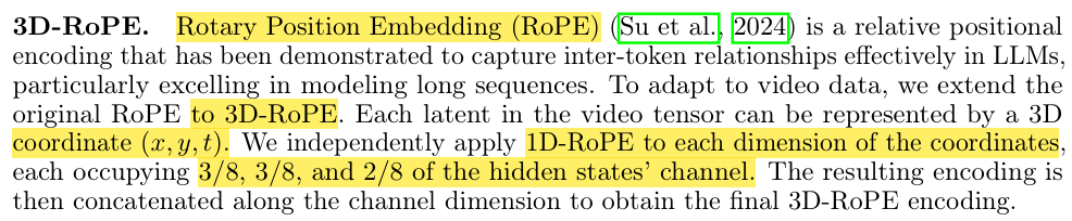 3D-RoPE는 video가 가지는 차원 (x,y,t)에 대한 positional information을 효과적으로 주기 위해서 사용되었습니다!