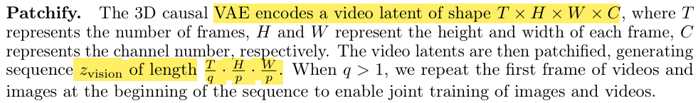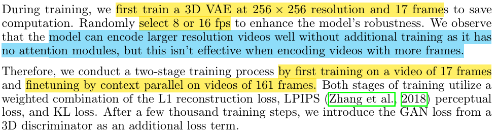 이때 특이하게 훈련 과정에서 256x256 resolution만 활용은 하는데, 그 이유는 저자들이 3D-VAE가 large resolution은 충분히 encoding할 수 있지만 long frames에 대해서는 잘 수행하지 못하는 걸 발견했기 때문이라고 합니다.