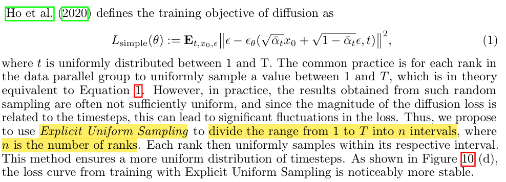 '기존에는 1~T 사이에서 랜덤한 t를 추출하는데, 이는 unifomly sampling을 기반으로 하지만 실제로는 그렇지 않을 수 있다. 따라서 [1, T]를 n개의 interval로 구분하고 각 interval에서 uniform하게 t를 추출해서 사용한다.'