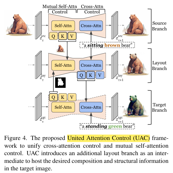 추가적으로, InfEdit은 United Attention Control (UAC)구조를 제안하여 attention feature를 통해 image editing을 도와주는 방법을 제안했습니다!