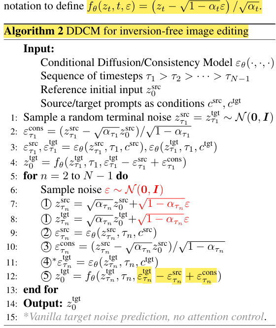 5. Line4: (target-source)_noise + noise_cons를 통해 target prompt에 해당하는 noise 정보를 input image에 서서히 더합니다.