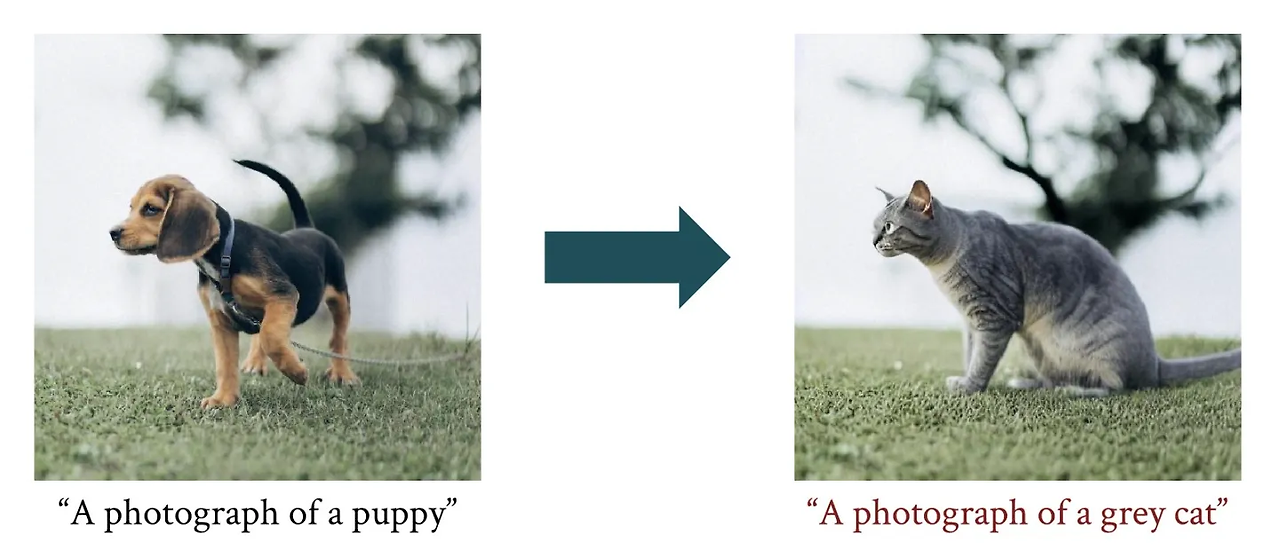 위의 예제처럼 puppy로 ddim inversion을 수행한 noise를 input으로 넣어서 cat prompt로 sampling을 하면, 기존 이미지의 특성을 어느정도 간직한 채 text prompt에 맞게 editing이 되는 것을 볼 수 있습니다.