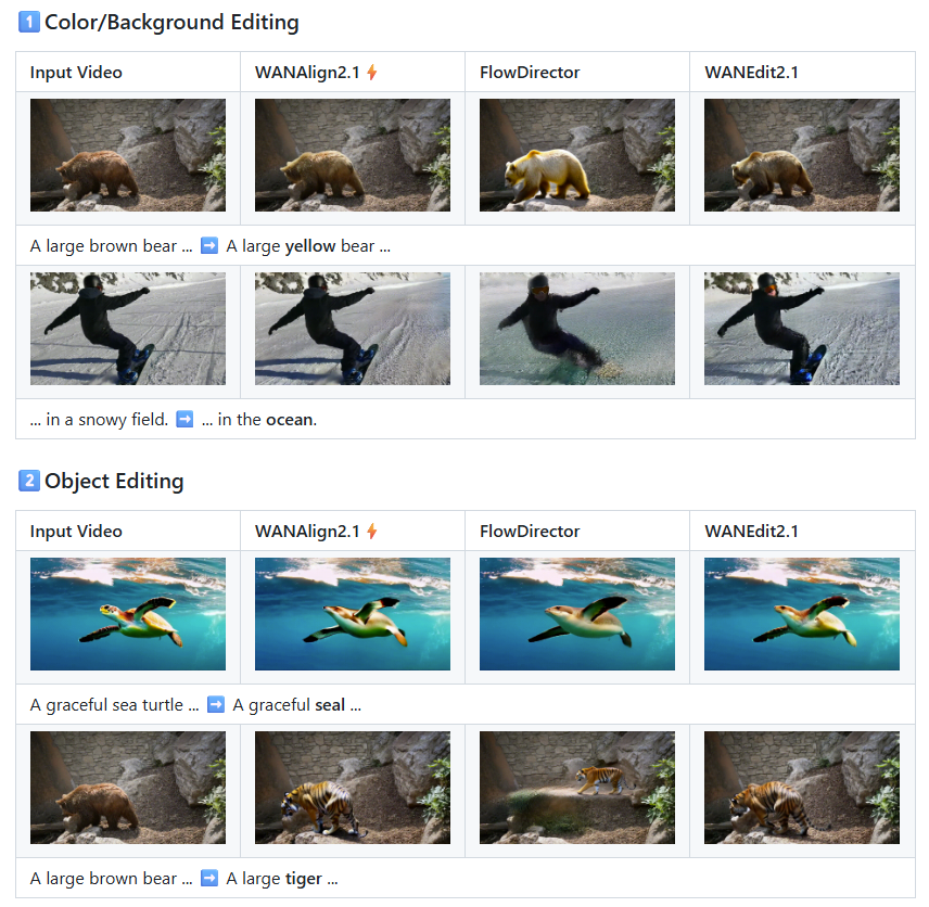 저는 최근에 나온 flowalign과 rectified flow 기반 video generation model인 WAN2.1을 통합하여 기존보다 더 빠르고 퀄리티 높게 video를 editing하는 WANAlign2.1⚡을 제작하여 공개합니다!😎😎