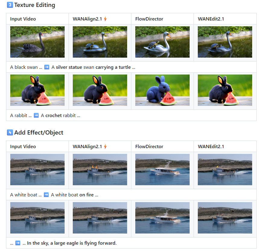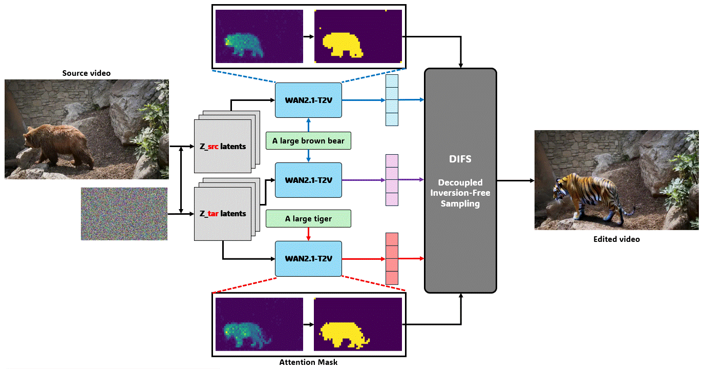 WANAlign2.1은 flowalign에서 제안한 inversion-free editing 수식을 sampling (denoising) 과정에 적용하여 훈련없이 input text에 맞춰 source video로부터 video editing을 가능하게 합니다!🐦🔥