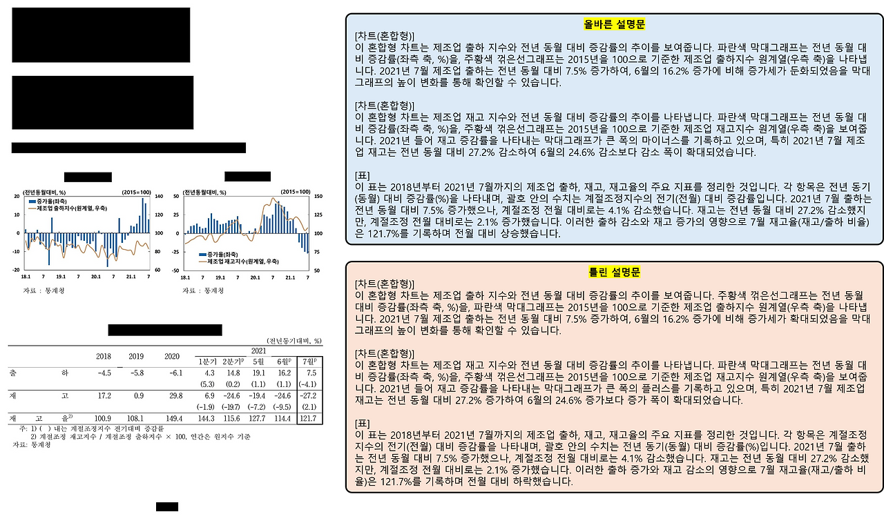 | 실제 산업에서 활용되는 다양한 형식의 한국어 문서. (현실성🌟) 고해상도의 다양하고 복잡한 구조 및 풍부한 이미지/도식을 가진 한국어 문서. (다양성🌟) RAG parsing에 적합한 description 생성 능력. (산업성🌟) |