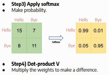 이 과정은 softmax로 부터 나온 matrix의 값이 서로 비슷할 때, V를 활용해서 특정 단어에게 가중치를 줄 수 있고, 또한 softmax로 나온 단어간의 관계성을 확실하게 잡아주는 역할도 해줍니다.