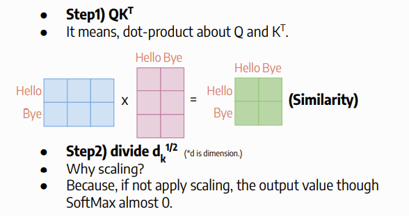 첫번째 단계로, Q와 KT 간의 내적 계산(dot-product)를 수행해줍니다.