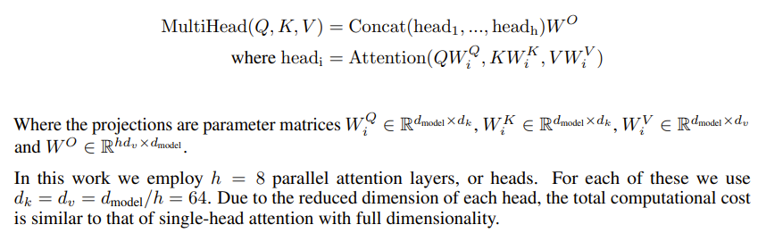 +) 논문에 차원에 대한 자세한 설명이 있는데, dk, dv dmodel의 차원은 512로 설정하였습니다. 그래서 WO의 dimension은 8*512 x 512가 됩니다.
