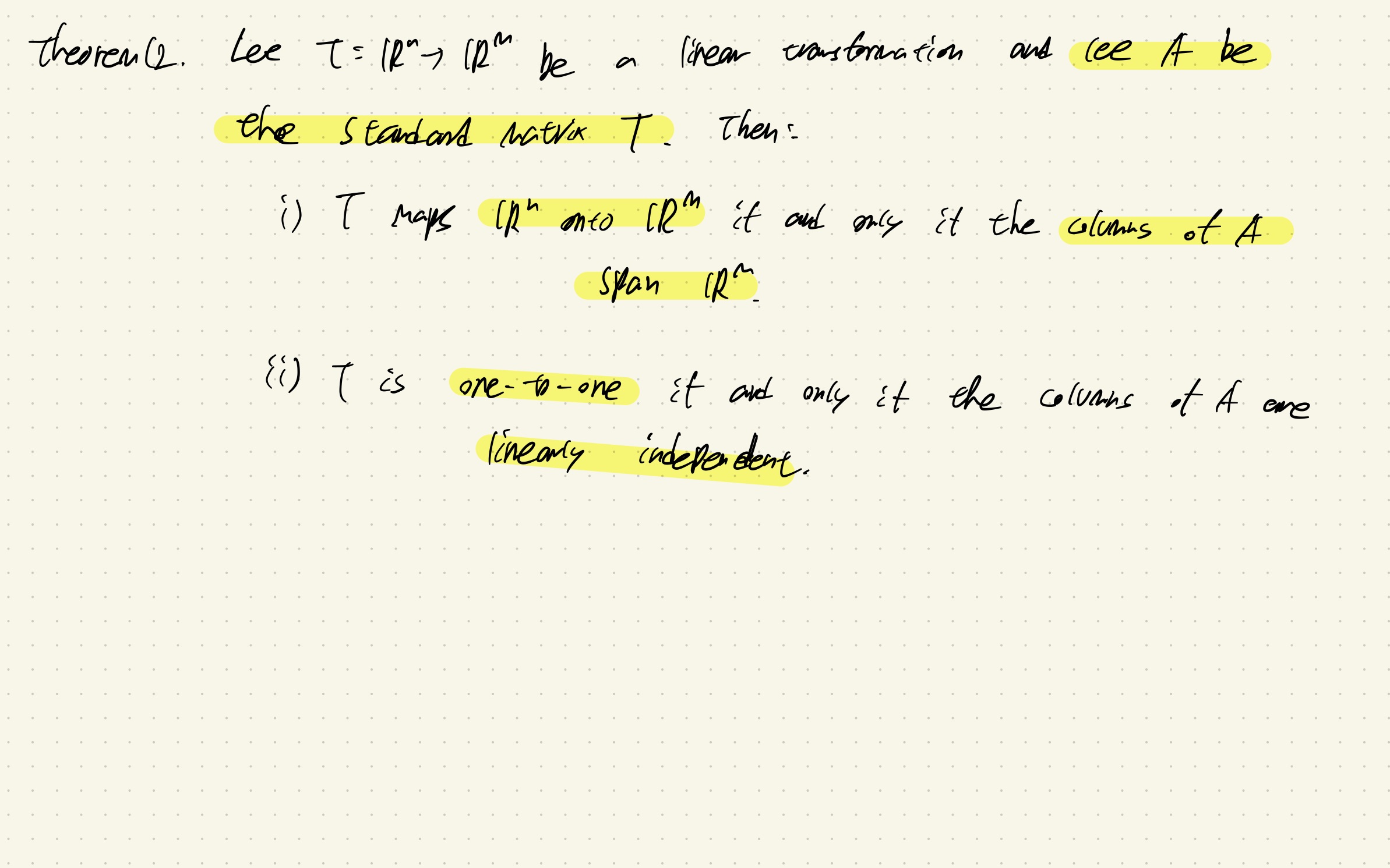 T가 onto이면 standard matrix A의 column은 span Rm이다.