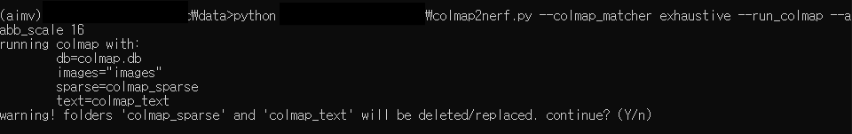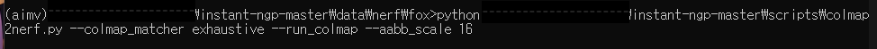 2-2. 해당 scripts 입력 후 실행: python [자신의 경로]\instant-ngp-master\scripts\colmap2nerf.py --colmap_matcher exhaustive --run_colmap --aabb_scale 16