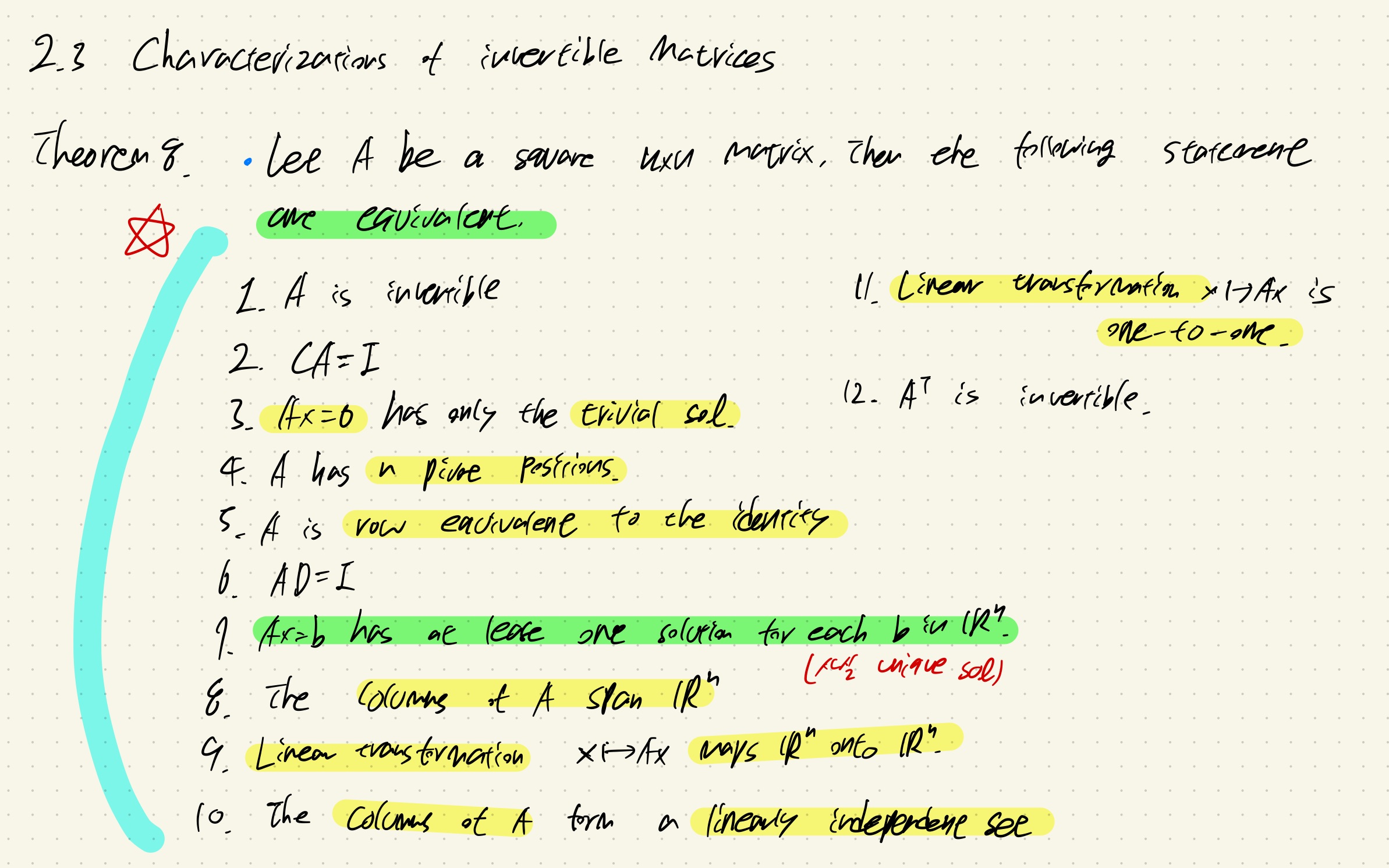 7. Ax = b has at least one solution for each b. (unique solution을 가진다고 표현하는게 더 정확)