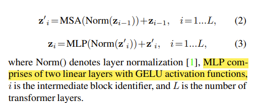 +) MLP 구조는 두개의 linear와 GELU activation function을 이용한다.