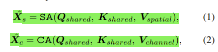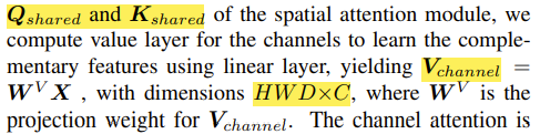 그리고 수식을 구성하는 Q, K, V를 보면 Q, K는 spatial, channel attention에서 서로 공유되는 matrix이고, V는 공유되지 않고 개별적으로 있다.