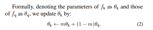그래서 MoCo는 단방향 backpropagation 구조를 가지고 있는데, 여기서 Momentum encoder의 parameters를 momentum의 식으로 update를 진행한다.