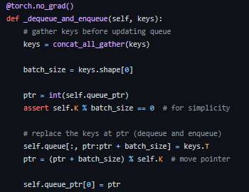 Momentum encoder에서 나온 keys값으로 queue에 업데이트 해준다.
