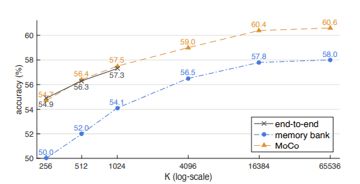 +) 논문의 저자들은 사전에 정의되는 queue의 개수(negative sample의 개수)가 많으면 많을수록 성능이 좋다는 것을 증명했다.