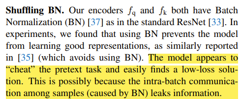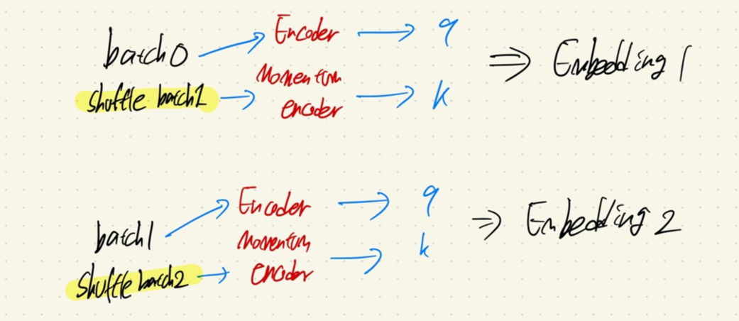논문의 저자들은 2개의 batch가 각각 encoder와 momentum encoder로 들어가고 나서 나온 output에 대해서 Shuffling Batch Normalization을 실행한다.
