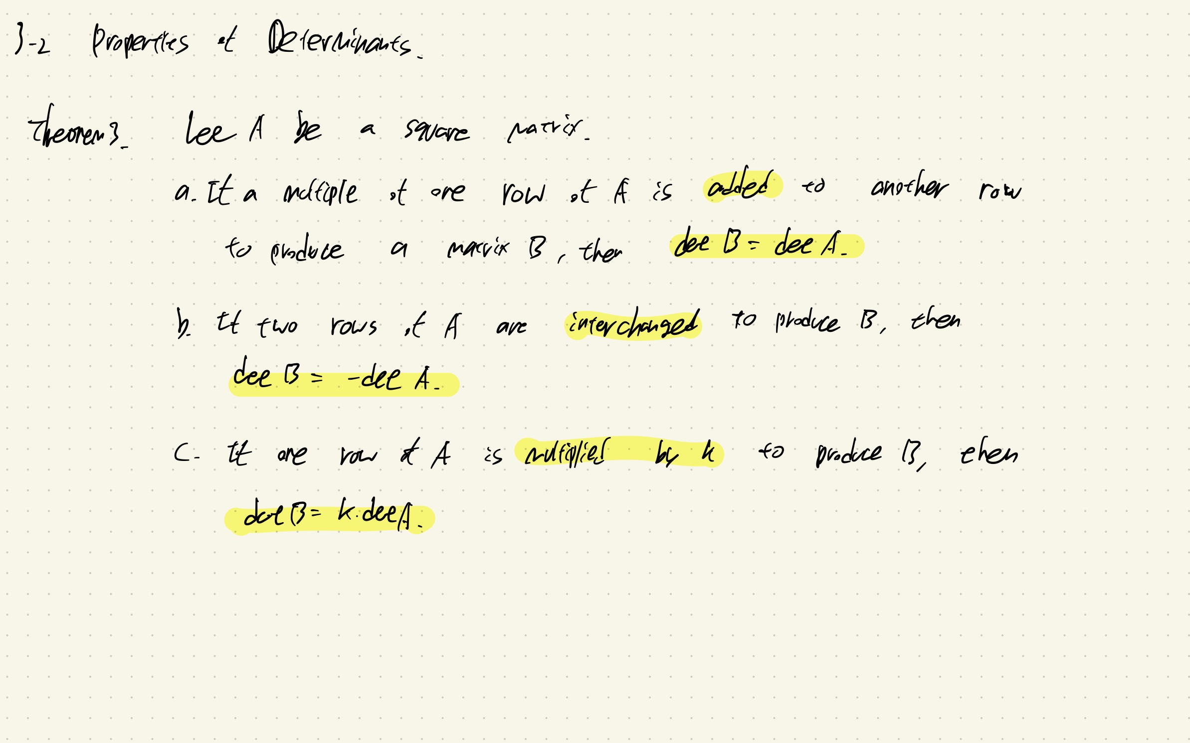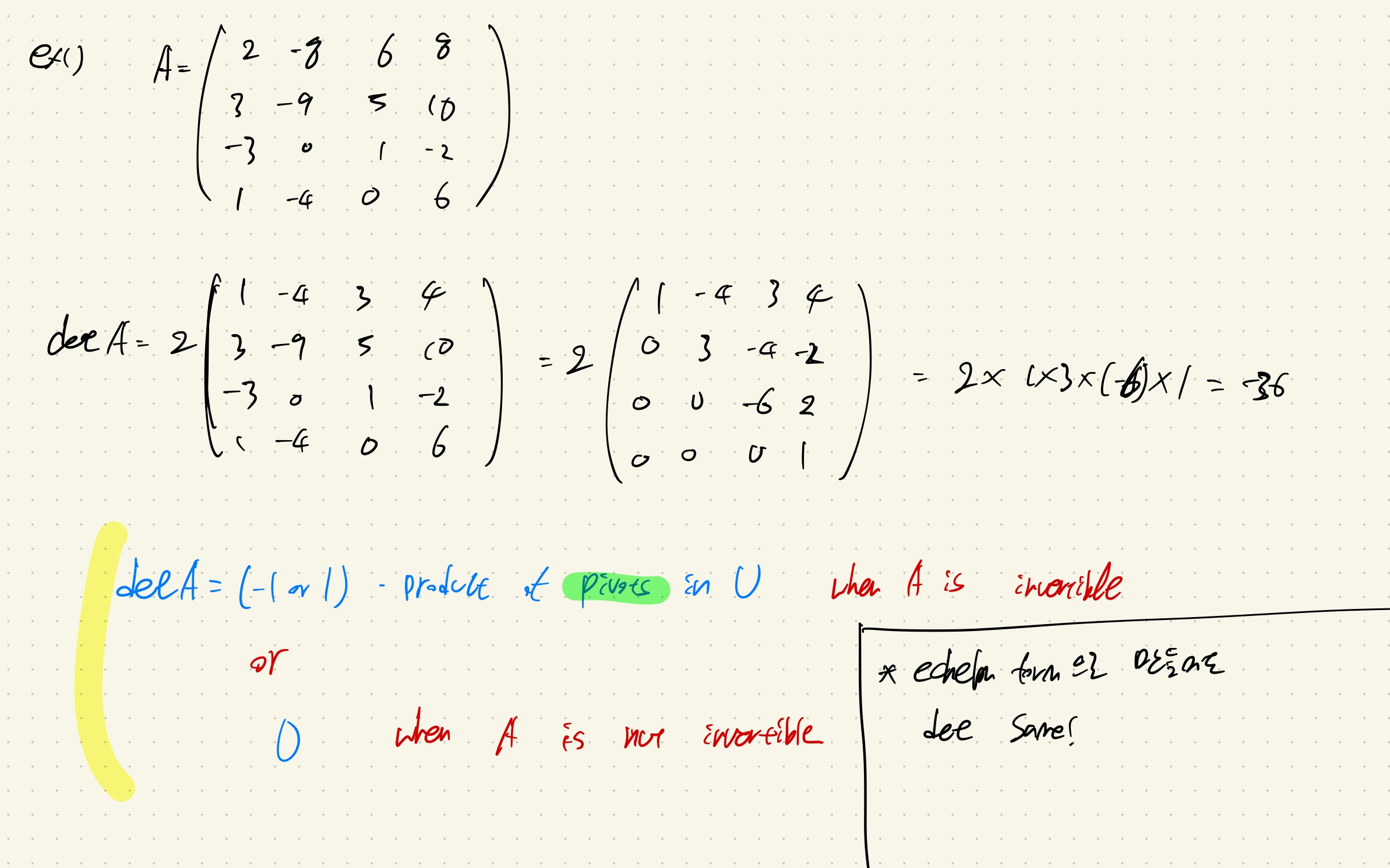 Determinants를 구할 때, matrix A를 echelon form으로 만든 후, diagonal의 성질을 이용해서 구한 determinants와 A로 부터 바로 계산한 detA의 값이 같다는 성질!!