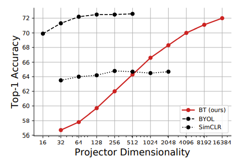 +) Redundancy reduction term을 이용해서 embedding vector에서 중복되는 정보가 없도록 만들어주기 때문에 projection layer의 dimension이 클수록 성능이 올라간다는 것을 논문에서 증명했다.